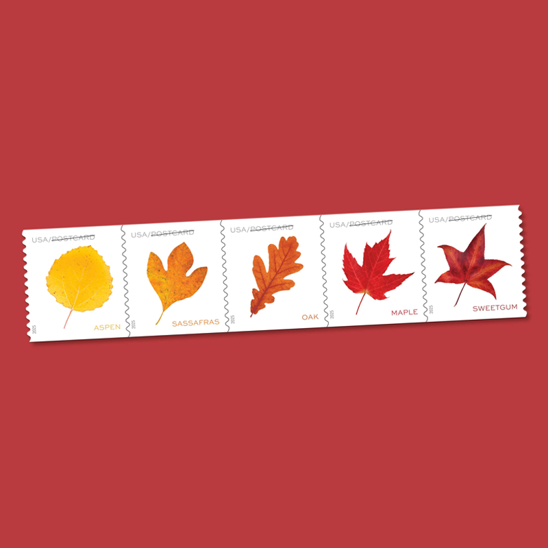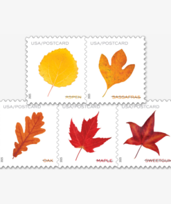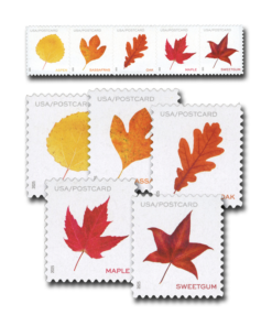 Five new postcard stamps depicting colorful leaves from trees abundant in this country evoke a seasonal walk in the woods.